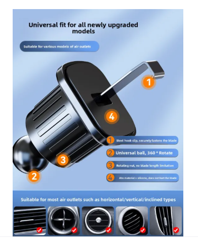Easy to install with a clip-on design, this mount attaches securely to your car's air outlet without damaging your dashboard.